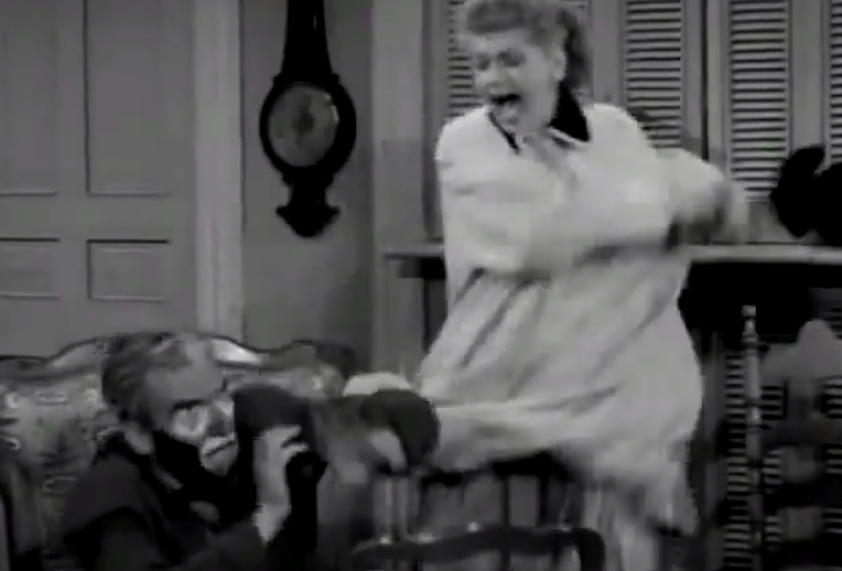 Back on 1951 Misogyny Street, Lucy’s returned to the kitchen, where she sweeps and hopes Ricky won’t be mad at her. She’s still wearing Buffo’s costume under her apron.