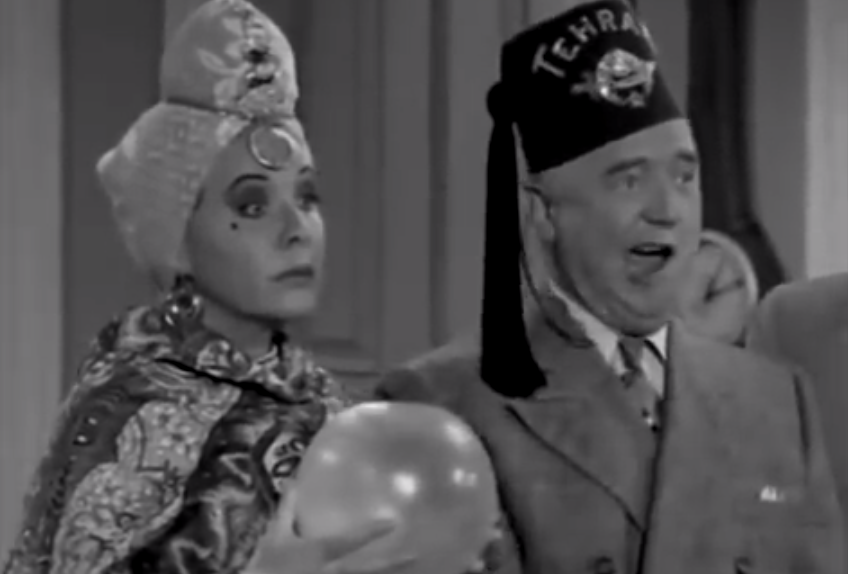 He introduces Ethel as “Medium Raya.” Ethel bows, and he says, “Well done, Medium Raya,” and oh how everyone laughs. Ethel is wearing a rug and carrying the bowl that would go over a wall sconce. Today this scene would get the whole cast and crew tried for hate crimes.