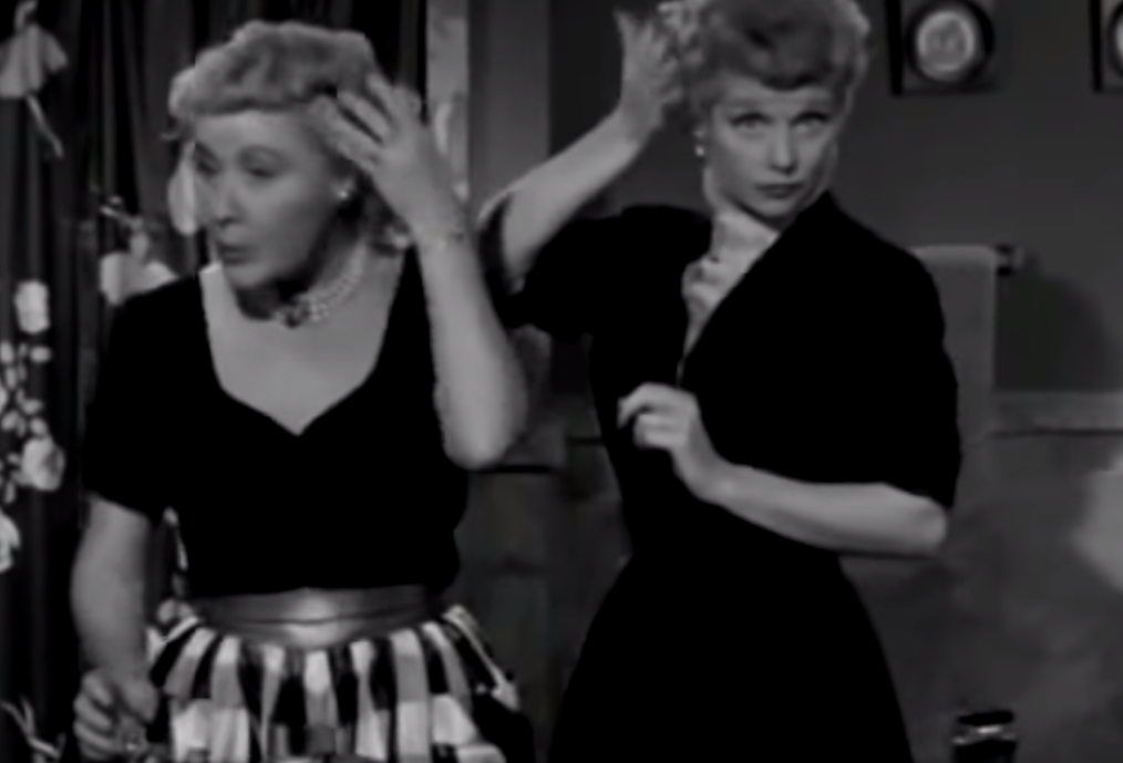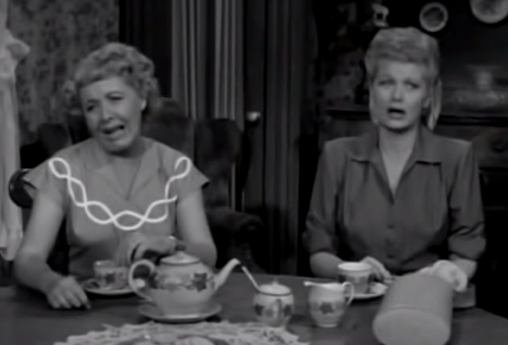 To get the girls to leave, Fred and Ricky insult their faces so they’ll go powder their noses. To get the guys to leave, Lucy and Ethel ask for water.