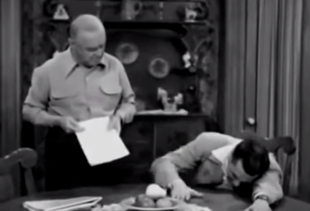 Ricky finds out Fred is acting in the play, and he falls to the table laughing.