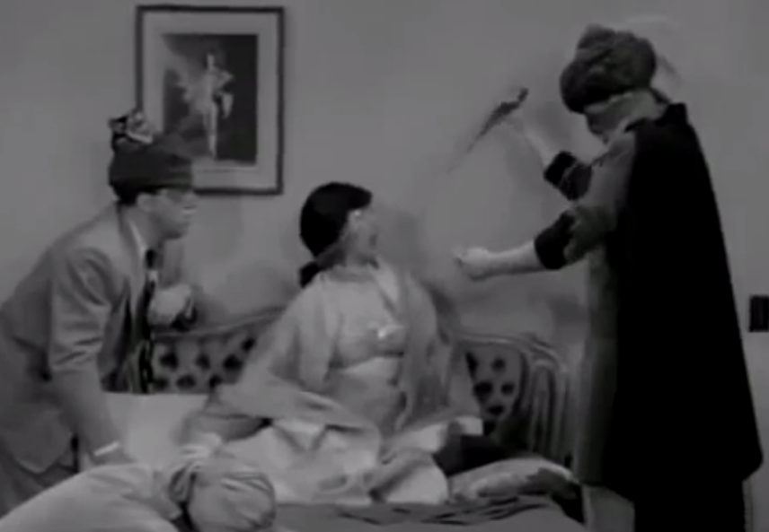 They stab the police chief and tell Lucy and Ethel the Tiger is coming and they’re going to be stabbed and sliced and whipped, etc. And then the Tiger enters and starts threatening to torture them.