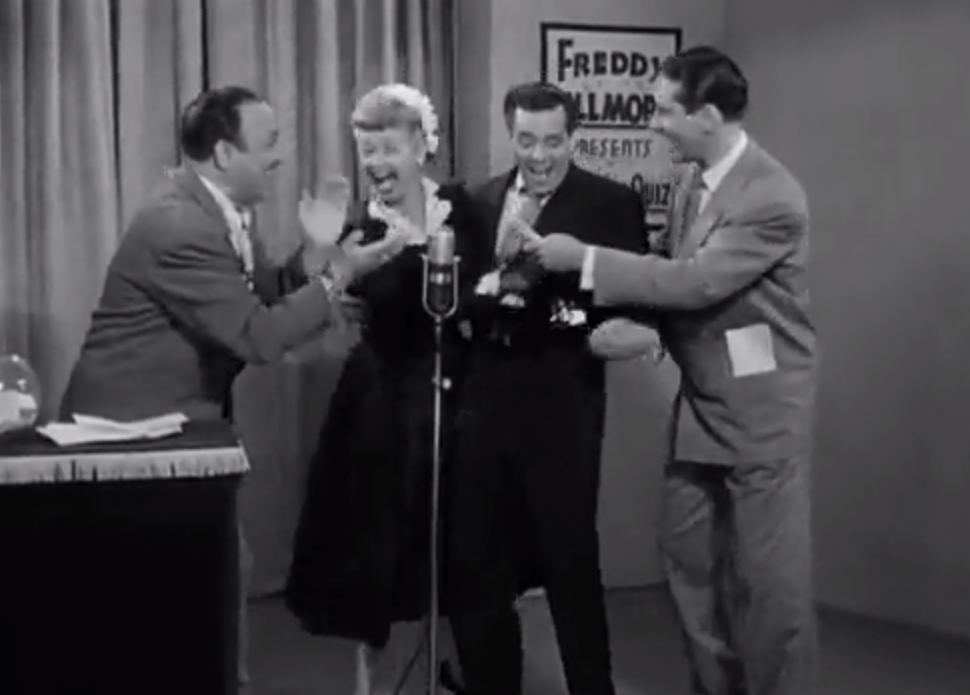 Finally, Lucy and Ricky go to the show. It’s Mr. and Mrs. Quiz, where married couples have to answer the questions together. So, sorry, gay people who were closeted, imprisoned, or being brutally assaulted and killed all over America at the time. You also can’t do a really shitty radio show with your secret lover.